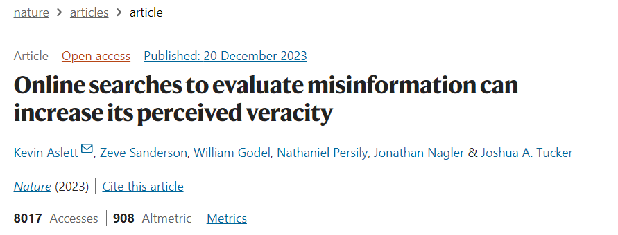 论文题目:Online searches to evaluate misinformation can increase its perceived veracity 论文期刊:Nature 论文地址:https://www.nature.com/articles/s41586-023-06883-y