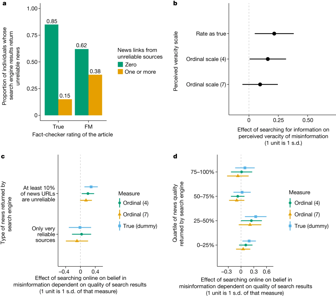 图2:a)在网上搜索虚假/误导或真实文章时,在谷歌搜索结果中接触到不同程度不可靠新闻网站的个人比例。b)线性回归模型的平均处理效果和 95% 置信区间。c,d)新闻质量最低四分位数和新闻质量次低四分位数的受访者中,与对照组相比,个人将虚假/误导性文章评为真实的概率。
