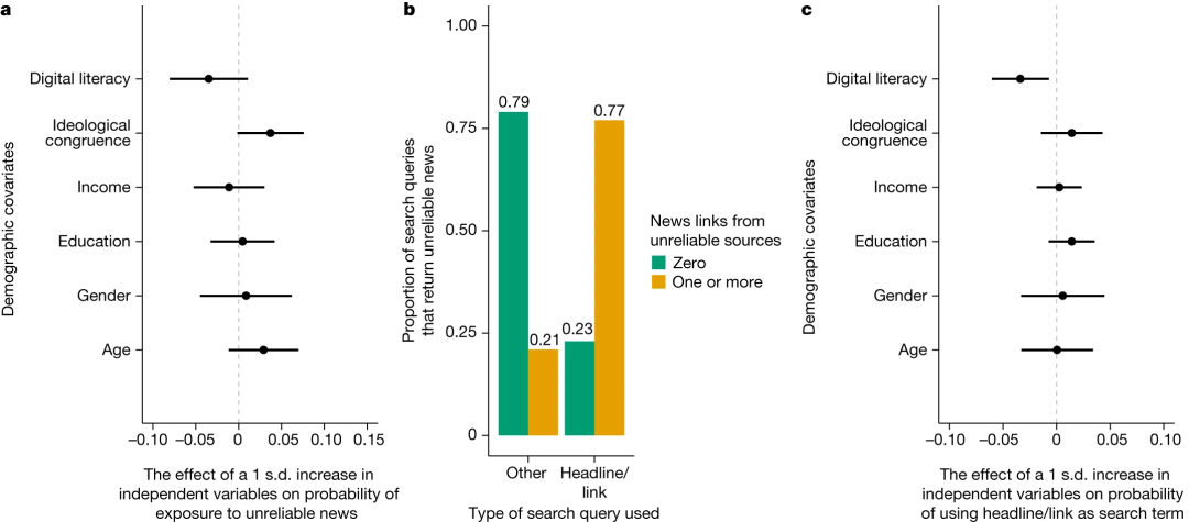 图3:对评估网上错误信息时接触到不可靠新闻网站的个人进行分析。a)人口统计学变量对在线搜索虚假/误导性新闻文章时接触到不可靠新闻来源的概率的影响。b)在网上搜索虚假/误导性文章时,谷歌搜索返回不同数量的不可靠新闻网站的比例。c)人口统计学变量对在线搜索虚假/误导性新闻文章时点击特定标题的概率的影响