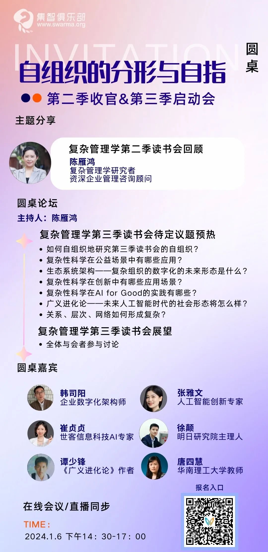 扫码参与复杂管理学第二季读书会,加入群聊,获取系列读书会回看权限,成为复杂管理学社区的种子用户,与社区的一线科研工作者与企业实践者沟通交流,共同推动复杂管理学社区的发展。