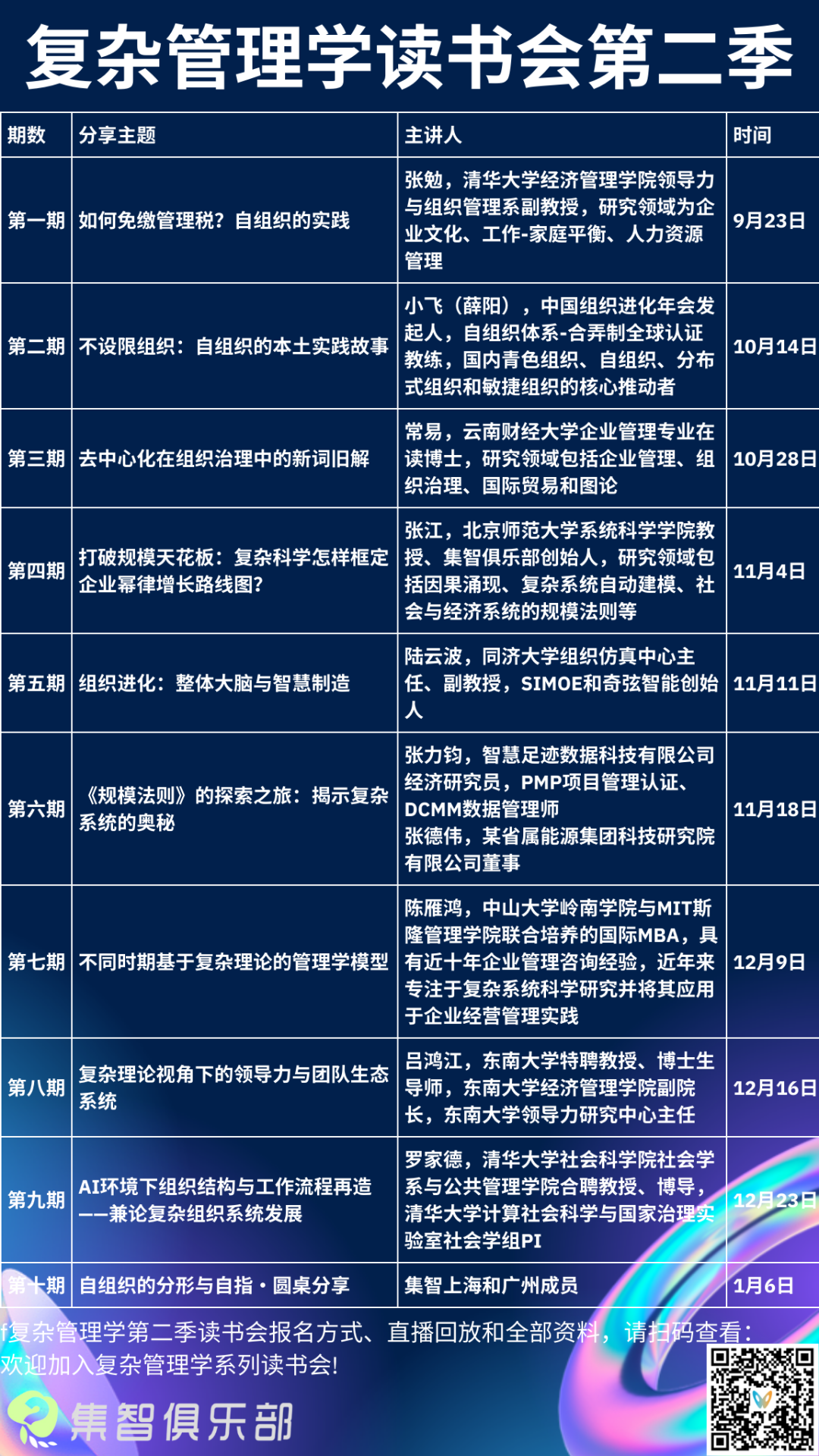 在近三个月读书会期间,我们深入探讨了复杂科学理论在复杂系统管理场景的应用、实践与展望,聚焦在自组织、DAO、创新型管理、网络等方向,分享复杂系统管理领域的前沿理论、经典科普图书,旨在促进学术交流、知识分享以及跨领域合作。系列读书会直播分享结束后,我们将长期维护读书会微信群,交流相关学术信息和文献。