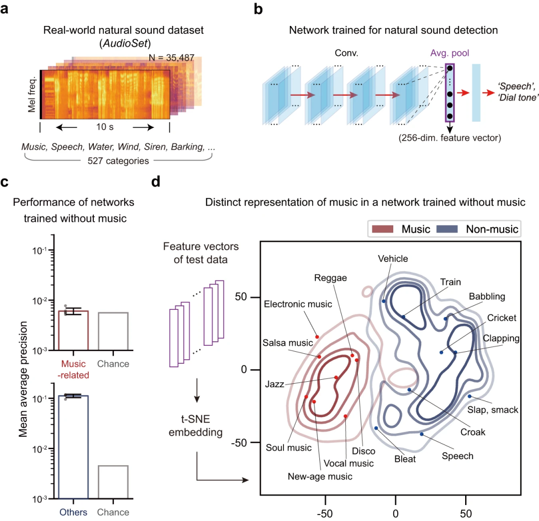 图1:a)实验流程:在无音乐的自然声音检测中训练的深度神经网络对音乐的独特表征。b)用于检测输入数据中自然声音类别的深度神经网络架构。c 在没有音乐的情况下,对音乐相关类别(顶部,红条)和其他类别(底部,蓝条)进行训练的网络的性能。d 网络特征向量的 t-SNE 嵌入密度图。