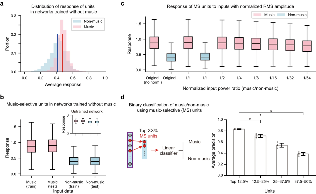 图2:a)无音乐训练网络中各单元对音乐(红色)和非音乐(蓝色)刺激的平均反应直方图。b 音乐选择性单元对音乐(红色)和非音乐刺激的反应。插图:未训练网络中 MSI 值最高的 12.5% 单元对音乐和非音乐刺激的反应。c)音乐选择性单元对音乐(红色)和非音乐(蓝色)的响应,使用的是标准化振幅的训练数据集。d 使用音乐选择单元的响应(左)和线性分类器的性能(右)对音乐和非音乐进行二元分类。