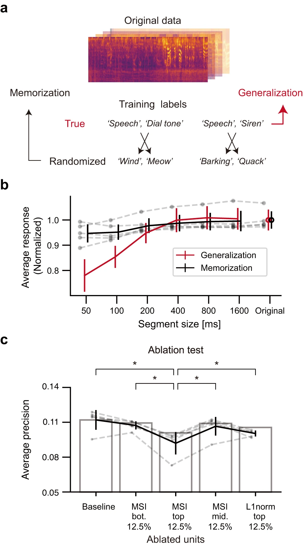 图3:使用未包含音乐训练的网络示意,b)与一般性网络相比,用随机标签训练的网络中 MSI 值最高的 12.5% 单元对音乐的响应。为了对两种情况进行归一化处理,每个反应都除以每个网络对原始声音的平均反应。c)特定单元消减后的消融检验(ablation test)后的网络性能,去除表征音乐的单元对网络性能影响最大