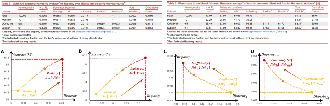 为了验证该技术在各种联邦学习设定下不同水平公平性上的有效性,作者在四个真实数字医疗数据集上进行了应用实验,实验结果表明该方法可以有效提升任意指定水平上的公平性。此外,不同指标(包括准确率与不同水平上的算法公平性等)之间往往存在着权衡取舍,FedUFO算法可以使用户根据实际需求灵活地平衡不同指标。