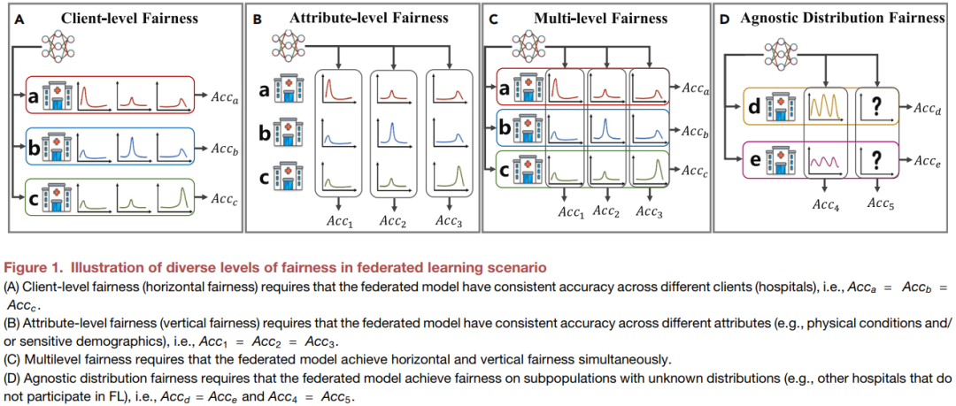 图1:医疗领域联邦学习场景中不同水平的算法公平性示意图