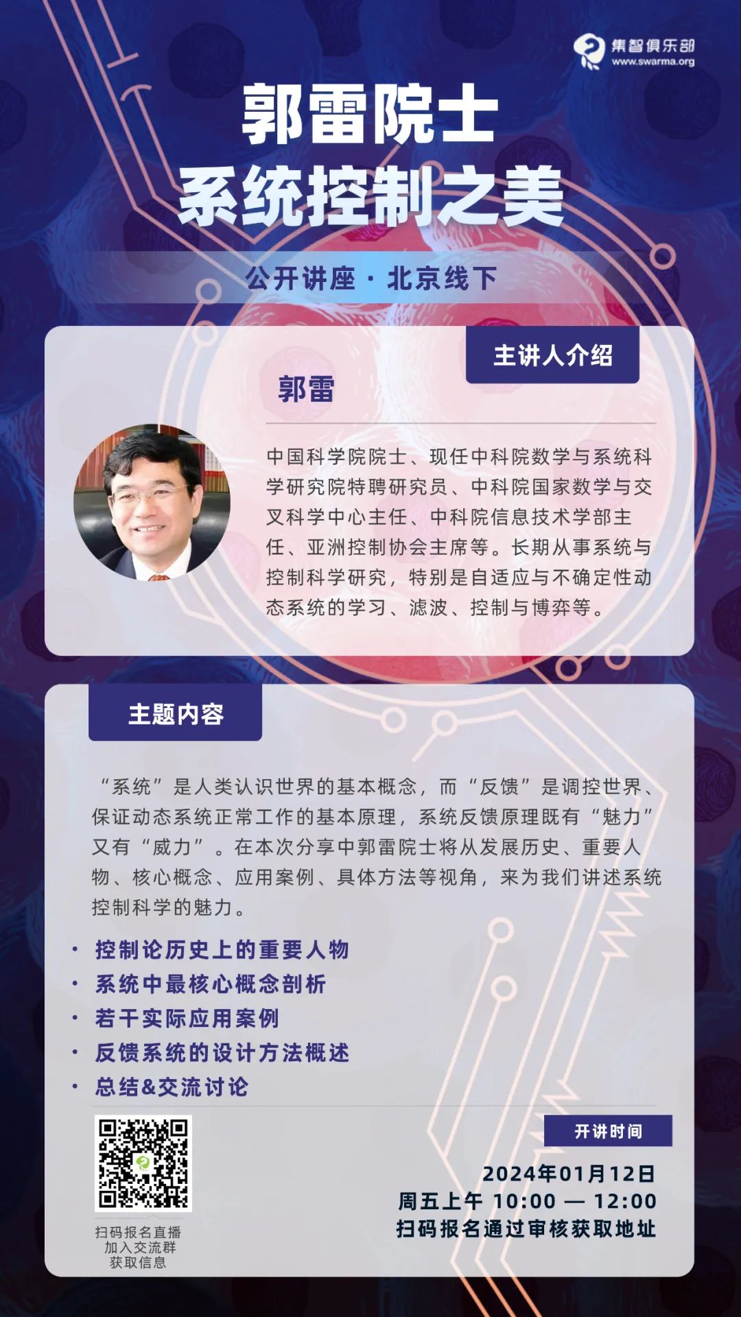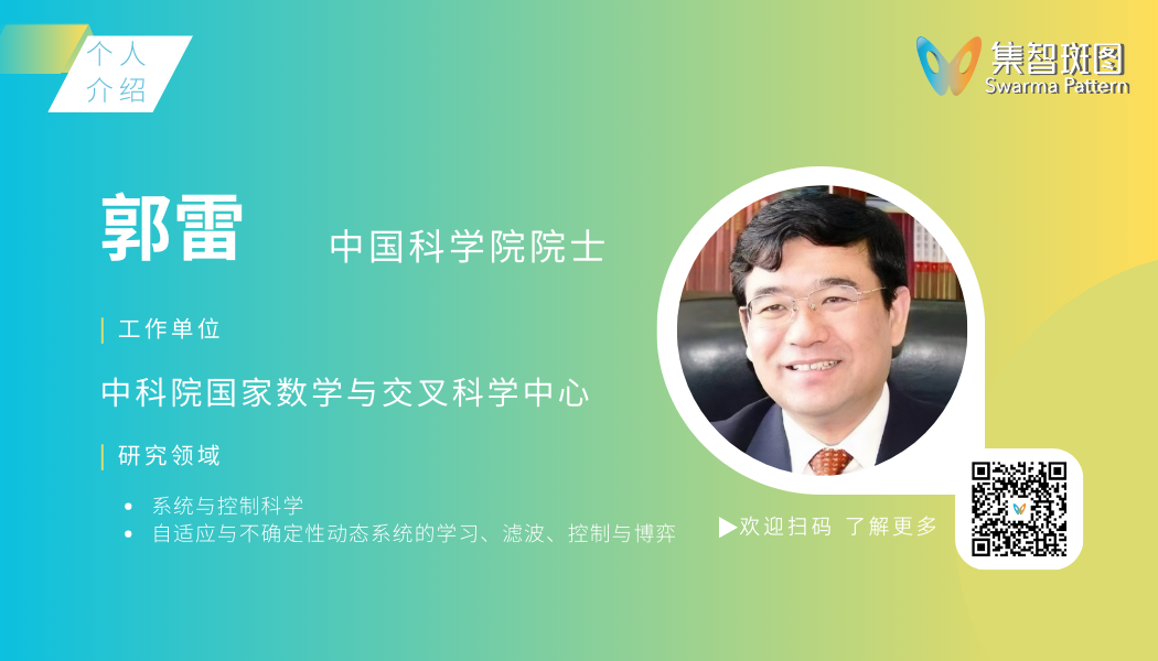 郭雷,中国科学院院士、现任中科院数学与系统科学研究院特聘研究员、中科院国家数学与交叉科学中心主任、中科院信息技术学部主任、亚洲控制协会主席等。曾任中科院数学与系统科学研究院院长、中国工业与应用数学学会理事长、国际工业与应用数学世界大会主席、中国大百科全书(三版)系统科学卷主编等。他是中国科学院院士,发展中国家科学院院士,瑞典皇家工程科学院外籍院士,瑞典皇家理工学院(KTH)荣誉博士,美国IEEE会士,国际自动控制联合会会士,中国工业与应用数学会会士,中国自动化学会会士等。2019年他因为“在自适应控制、系统辨识、自适应信号处理、随机系统及应用数学领域的根本性和实际性贡献” 而获得IEEE控制系统学会(CSS)颁发的波德奖(Hendrik W. Bode Lecture Prize),是获此国际学术大奖的首位华人科学家。多次在控制与数学等领域国际顶级学术会议上作特邀报告。