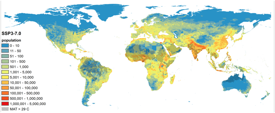 系统性气候风险的潜在危险显而易见:在全球气候逐渐变暖的背景下,最脆弱的国家和社区将继续遭受最沉重的打击,从而加剧社会不平等现象。图1展示了预测的人口密度与极端年均温度(MAT)超过29°C的地区的交集(这样的温度目前仅占地球陆地面积的0.8%)。按照中高排放和人口增长的情景(SSP3-7.0排放和SSP3人口增长),到2070年,大约将有20亿人居住在这些极端高温地区。而现今,仅有3000万人居住在高温地区,主要分布在撒哈拉沙漠和海湾沿岸[43]。