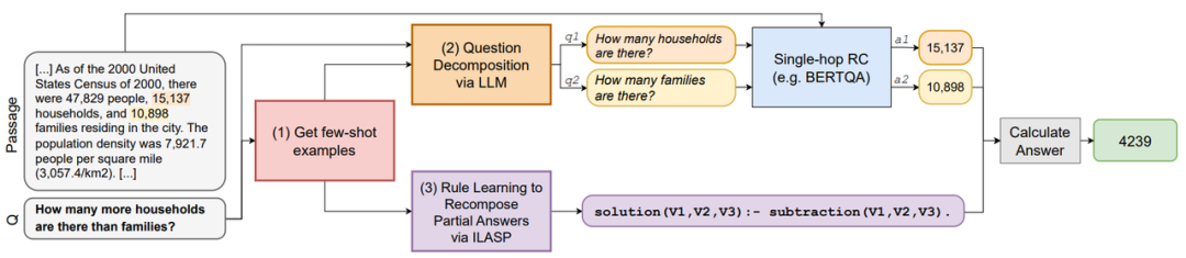 虽然人们已经提出了一些提示策略来引导大型语言模型进行推理,但对于机器阅读理解任务,数值推理依然是一个挑战。研究者们提出了一种神经符号方法,利用 LLM 的上下文学习能力将复杂问题分解成更简单的子问题,并采用符号学习方法学习重组部分答案的规则。该方法在 DROP 基准的不同数字子集上进行了评估;结果表明,这种方法与为 DROP 专门设计的 SOTA 模型竞争力相当,并且显著优于纯粹依靠 LLM 提示的方法。此外,该方法具有数据效率高的特点,因为它无需进行任何额外的训练或微调。神经符号方法还促进了鲁棒的数值推理能力,确保模型忠实于其所呈现的文本,并提供可解释和可验证的推理过程。