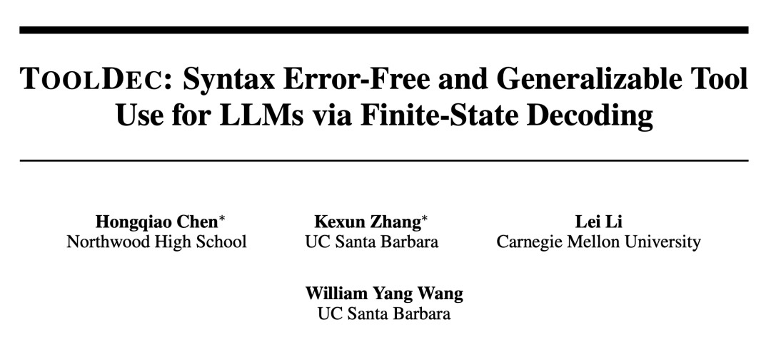 大型语言模型已经展示了在使用外部工具方面的令人瞩目的能力。然而,现有方法依赖于微调或上下文学习来使用工具,这些方法会产生语法错误且难以泛化。本文提出了 ToolDec,一种基于有限状态机引导的解码算法,用于工具增强型 LLM。ToolDec 通过确保工具名称的有效性和参数类型的一致性,消除了与工具相关的错误。此外,ToolDec 使得 LLM 能够仅仅根据工具的名称来有效地选择工具,无需进行针对特定工具的微调。作者们在多个应用题问题数据集上的实验表明,ToolDec 将语法错误降至零,从而显著提升了性能,并且速度提高了最多2倍。研究还显示,在从未见过的工具上,TookDec 的泛化性能比基线高达8倍。