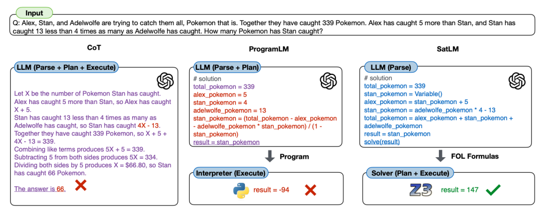 先前的工作将思维链技术与程序化表达结合在大型语言模型(LLMs)中,用以进行推理。这种方法对于只需单向推理的任务(例如,简单的算术问题)效果良好,但对于需要更复杂规划和搜索的问题,则效果不佳。在本文中,作者提出了一种名为可满足性辅助语言建模(SATLM)的新方法来增强 LLMs 的推理能力:利用 LLM 生成一个声明式任务说明而非命令式程序,并且借助现成的自动定理证明器来得出最终答案。通过将实际推理任务外包给自动定理证明器,这种方法能够保证相对于解析出的规格的答案的正确性,并避免在解题过程中发生规划错误。该研究在 6 个数据集上评估了 SATLM 的表现,并指出它在命令式范例中持续超越了程序辅助 LLMs 的性能。特别地,在 GSM 算术推理数据集的一个具有挑战性的子集上,SATLM 比程序辅助 LLMs 的性能高出 20% 以上;同时,在法学院入学考试(LSAT)和 BOARDGAMEQA 上,SATLM 也达到了新的 SoTA。
