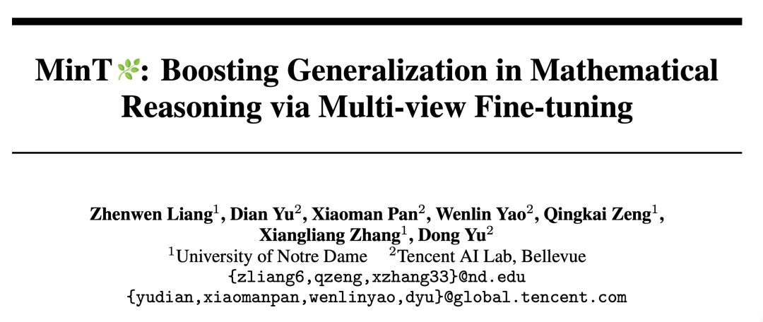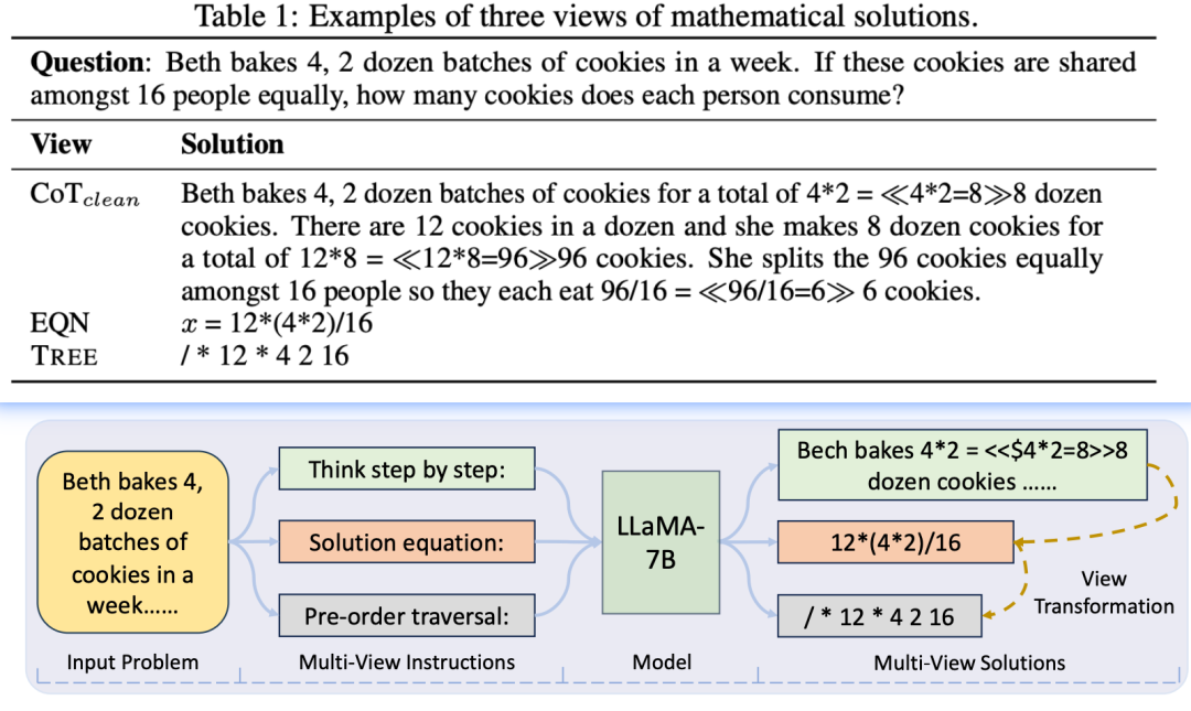 数学领域的推理对于相对较小的语言模型(LMs)依然是一个重大挑战。许多现行方法专注于使 LMs 专长于数学推理,并且严重依赖从强大但效率不高的大型语言模型(LLMs)中提取知识。在这项工作中,研究人员探索了一种新方向,避免过度依赖 LLM 教师,引入了一种多视图微调方法,该方法有效利用了具有多样化注释风格的现有数学问题数据集。该方法独特地考虑到各种注释格式作为可能互相帮助的不同“视图”,并在训练模型时利用它们。通过在输入问题后附加不同的指令,模型可以灵活地学会以多种格式生成解决方案。实验结果表明,该策略使相对较小的 LMs 的表现超越了先前严重依赖知识蒸馏的方法,以及精心建立的基线。此外,所提出的方法赋予模型在不同视图和数据集上的潜在泛化能力,以及从不准确或不完整的噪声数据中学习的能力。作者们希望通过多视图训练范式能激发其他机器推理领域未来的研究。
