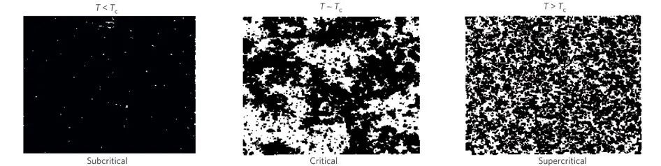 图-框 处于临界点的复杂现象。二维伊辛模型的数值模拟结果显示了三个温度下(亚临界、临界和超临界),某一时刻的自旋构型。只有在临界温度下,系统才会呈现出二阶相变特征,显示出高度异质的相关域,而亚临界和超临界条件下则呈现均匀状态。