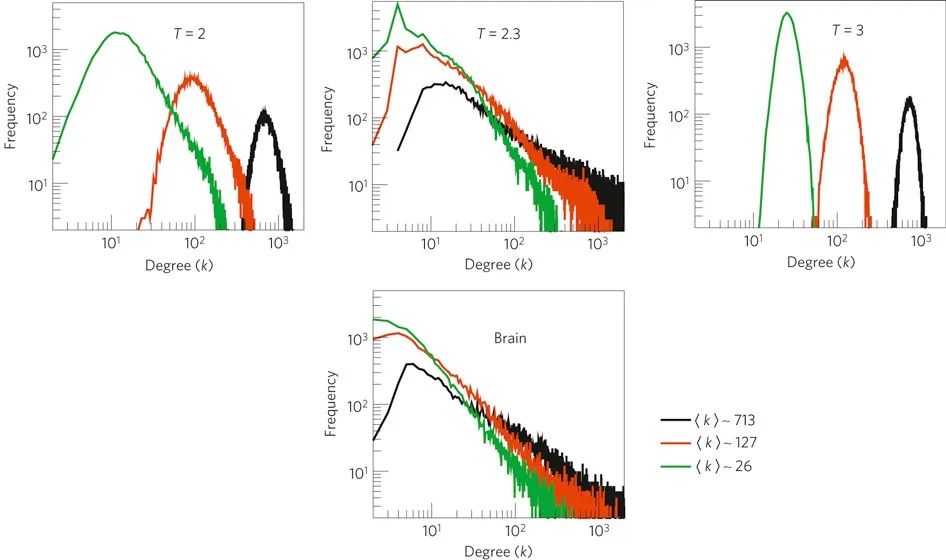 图3 从脑部功能性磁共振成像(fMRI)数据中得出的复杂网络仅在临界温度下与Ising模型相似。图示为来自fMRI大脑休息状态数据(底部图例)和在温度T=2、T=2.3和T=3时的Ising模型(顶部三个图例)在不同平均度值下的网络度(k)分布。