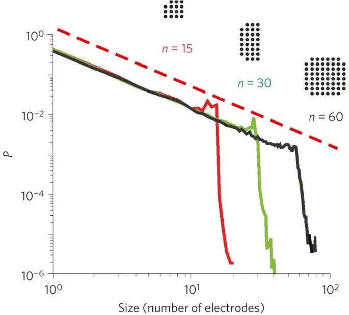图1 神经元雪崩是复杂的。在成熟的皮层培养网络中,神经元雪崩的大小分布遵循接近3/2的幂律(虚线表示),并显示出有限尺度缩放。图示为覆盖指定数量电极的雪崩观察到的相对概率,针对三组网格尺寸(插图中n=15、30或60个感应电极,等间隔200微米)。统计数据源自总共70小时的数据记录,每小时累积约58,000(±55,000)次雪崩(均值±标准差)。