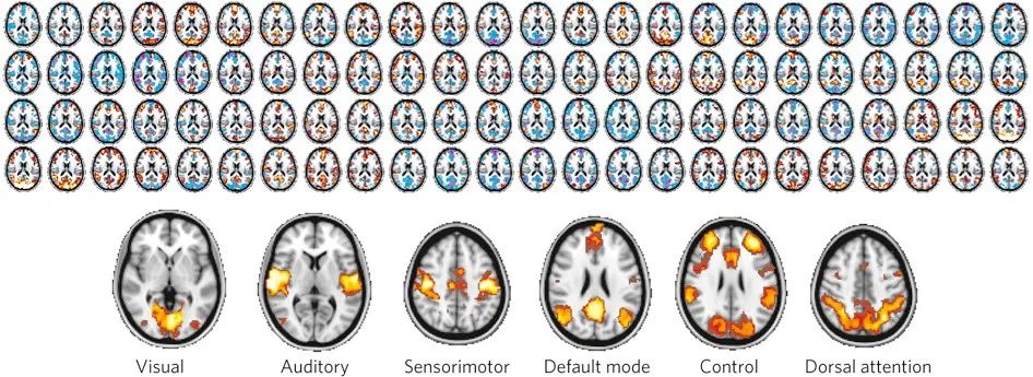 图2 大尺度涌现的脑网络。通过对自发活动的人脑时空模式中的相互作用进行分析,揭示了涌现网络。顶部图像序列以红色/蓝色显示了4分钟连续大脑休息期间相对于平均功能性磁共振成像 BOLD的增加/减少(单个受试者的连续数据,从左上角开始,每行为1分钟,图像间隔为2.5秒)。底部图像是计算网络内小区域活动与整个大脑之间线性相关性的结果(最亮的颜色表示最强的相关性)。这些网络对应于大脑的六个主要系统:视觉、听觉、感觉运动、默认模式、执行控制和背侧注意力。所表示切片来自蒙特利尔神经研究所,坐标为顶部序列的z=18,底部图像从左到右为z=0,8,44,24,26,44。