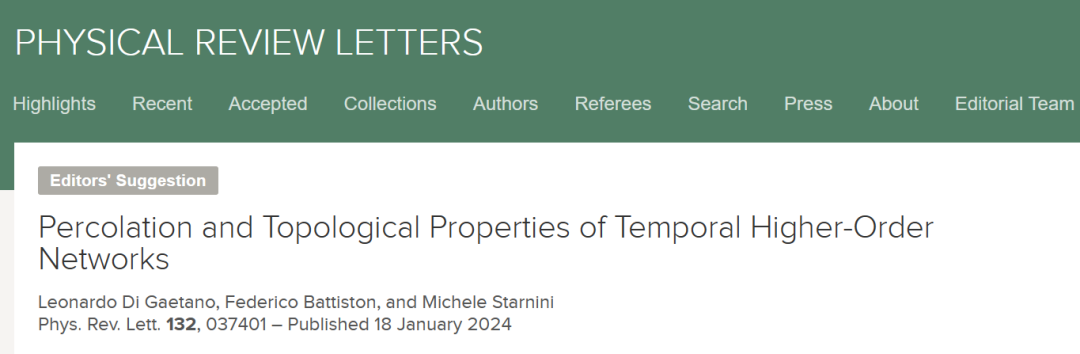 论文题目:Percolation and Topological Properties of Temporal Higher-Order Networks 论文期刊:Physical Review Letters 论文地址: https://journals.aps.org/prl/abstract/10.1103/PhysRevLett.132.037401