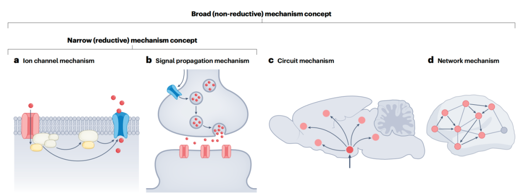 在神经科学哲学中,因果解释的讨论相当关注机制的概念。Mechanism在现代的使用起源于17世纪笛卡尔、牛顿、波义耳等人的机械主义哲学观点,把生命系统比作机器,由微观粒子通过机械相互作用产生宏观行为,为生命中的因果关系提供了还原论解释。与17世纪最初的机制概念类似,大约20多年前,现代“新机械主义”观点逐渐兴起,认为机械是由具有较低层次因果部分组成的层次系统,它们包含大量因果细节,部分之间通过力的作用、传递相互影响。在神经科学中,他们强调分子、细胞等低层级因素在解释大脑结构和功能中的重要性。随着这一领域工作的继续,许多人认为机械的概念是有局限性的,神经科学中还有其他类型的重要的因果系统,比如通路(pathways)、环路(circuits)、网络、拓扑限制等,一些重要的工作强调了生命系统的“过程”和“过程性”,关注了变化的因果系统。