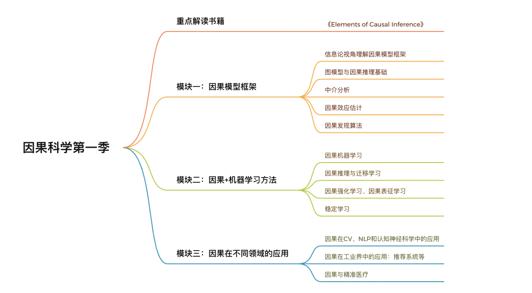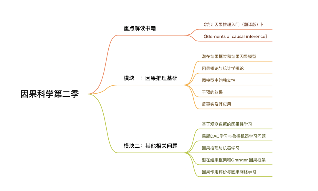 因果科学与CausalAI读书会第二季,围绕Judea Pearl 等人出版的《统计因果推理入门(翻译版)》以及 Bernhard Schölkopf 等人出版的书籍《Elements of Causal Inference》进行讨论,着重介绍如何计算干预分布,如何从观察和干预数据中推断因果模型,以及因果思想如何产生用于经典机器学习问题。