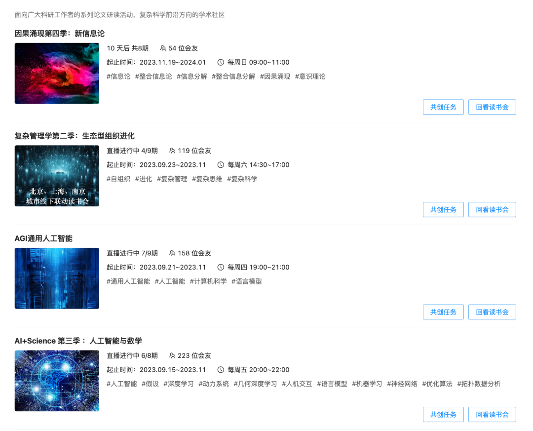 读书会活动始于 2008 年,至今已经有 50 余个主题,内容涵盖复杂系统、人工智能、脑与意识、生命科学、因果科学、高阶网络等。凝聚了众多优秀科研工作者,促进了科研合作发表论文,孵化了许多科研产品。如:2013 年的“深度学习”读书会孕育了彩云天气 APP,2015 年的“集体注意力流”读书会产生了众包书籍《走近2050》,2020年的开始因果科学读书会孕育了全国最大的因果科学社区等。
