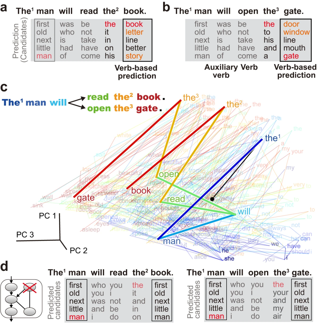 图2:cANN 的下一个单词预测和网络动态。a)a、b 两个句子中出现三个“the”(已索引)实例后的预测。c 通过 PCA 输入每个单词后浦肯野细胞神经活动的可视化。从句子的开头到结尾,单词以颜色编码,自发活动由黑点表示。d 循环信号被阻止时的预测