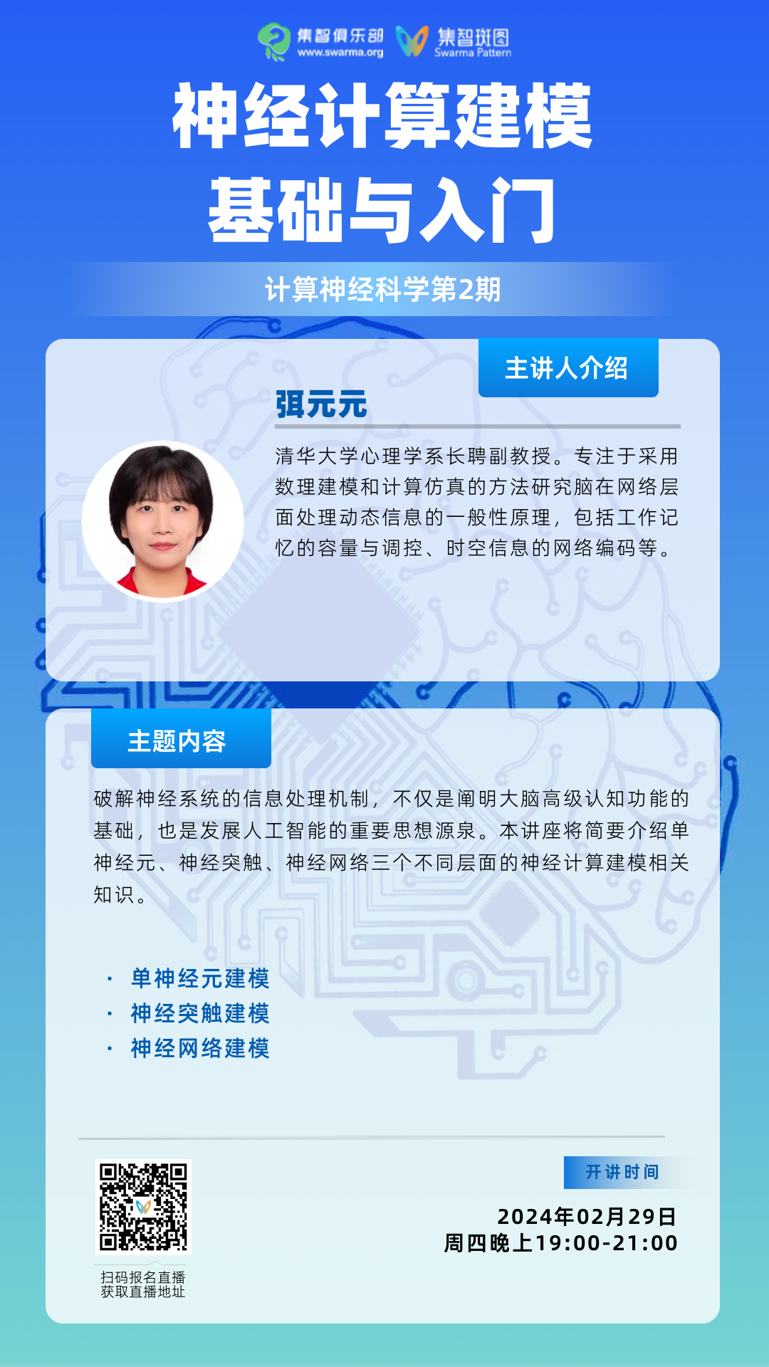 大脑的高级认知功能,如感知、运动、学习与记忆等,都是由海量神经元所构成的复杂神经网络来实现的。网络中的神经元接收外部输入信息,通过突触连接相互作用,在记忆、注意、情感等因素调控下,使得网络状态发生改变,进而实现了对信息的编码、存储、整合等操作。破解神经系统的信息处理机制,不仅是阐明大脑高级认知功能的基础,也是发展人工智能的重要思想源泉。本次分享简要介绍单神经元、神经突触、神经网络三个不同层面的神经计算建模相关知识。