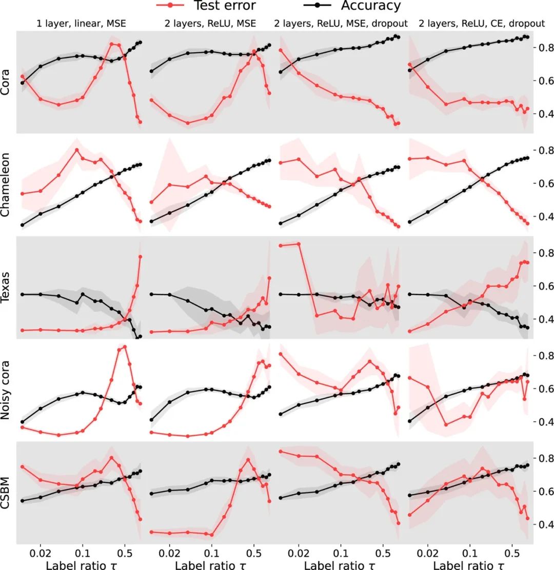 图1 在具有不同噪声水平的数据集上,针对不同图神经网络架构、不同损失(有或没有显式正则化)的双下降泛化。任务为节点分类,红色为测试误差,黑色为测试准确性。