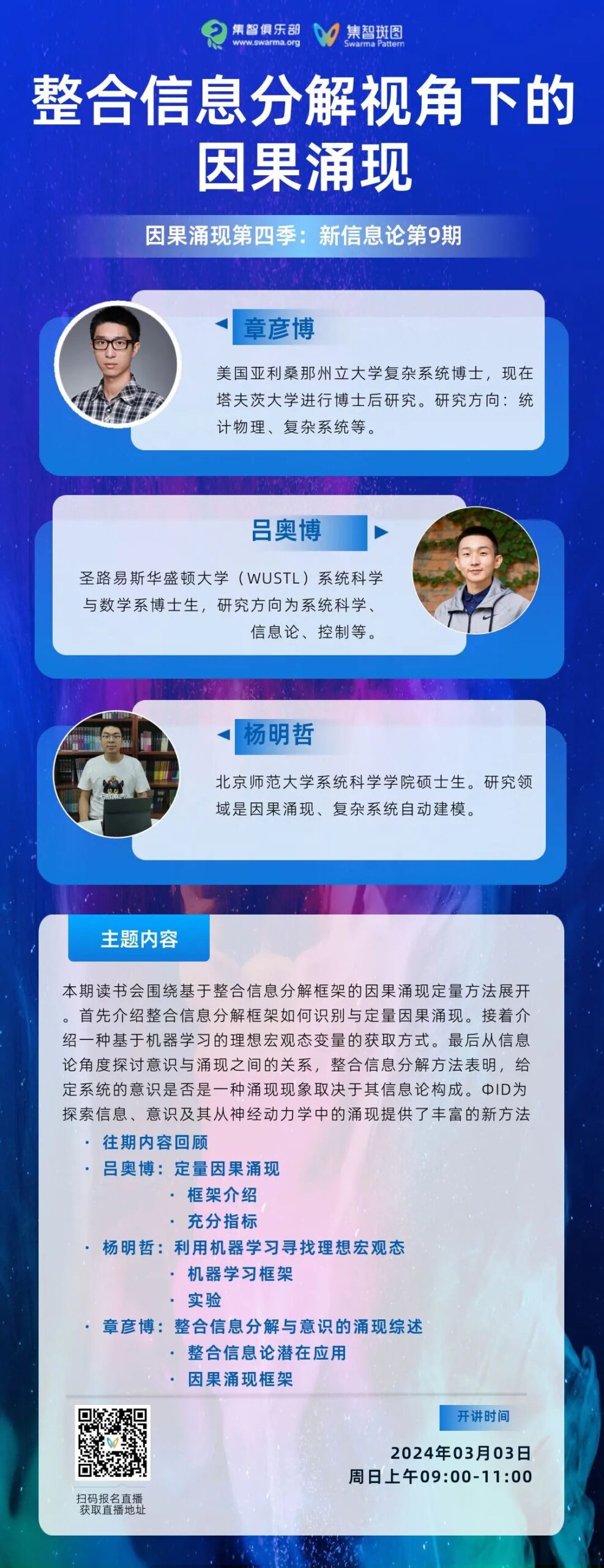 第三季读书会进一步围绕因果涌现的核心问题「因果涌现的定义」以及「因果涌现的辨识」进行深入学习和讨论,对 Erik Hoel 提出的 Causal Emergence,Causal Geometry 等因果涌现的核心理论进行探讨和剖析,并详细梳理其中涉及到的方法论,包括从动力学约简、隐空间动力学学习等其他领域中学习和借鉴相关的研究思路,最后探讨因果涌现的应用,包括基于生物网络、脑网络或者涌现探测等问题展开扩展,发掘更多的实际应用场景。请参看:因果涌现读书会第三季启动:深入多尺度复杂系统核心,探索因果涌现理论应用