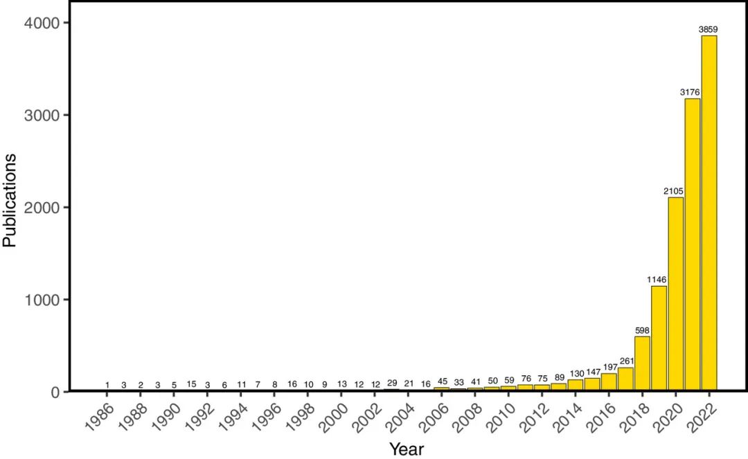 图3 Web of Science科学数据库中每年关于“人工智能”或“机器学习”的论文数量的逐年变化趋势。