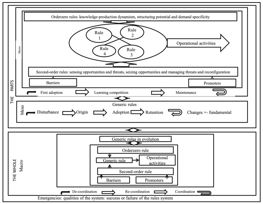 源于动态能力理论、创新博弈理论和知识创造理论的元素与二阶规则相联系。创新博弈理论提供了与零阶规则相关的元素,而配置理论则贡献了用于分析宏观层级所代表的规则结构内部互动的元素。