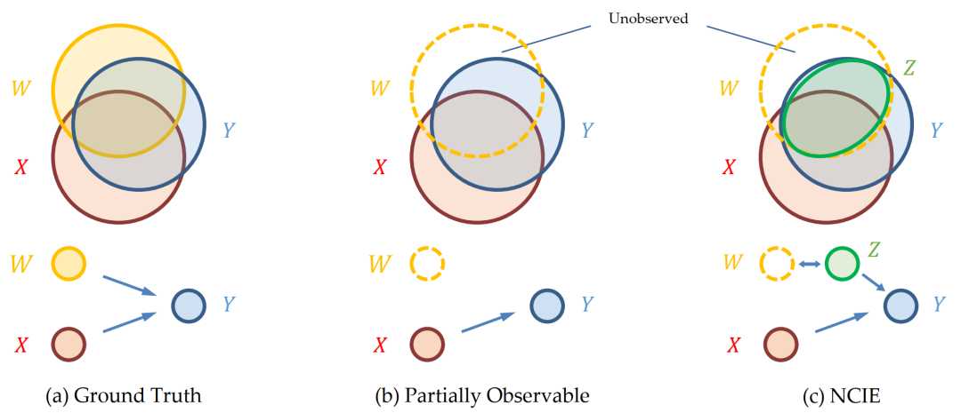 图1. 维恩图表示的信息,(a)基本事实的因果关系;(b)现实中部分可观测情景的因果关系;以及(c)由NCIE生成的隐变量Z的替代性因果关系表征,其中Y、X和W分别表示目标、观察到的原因和未观察到的原因