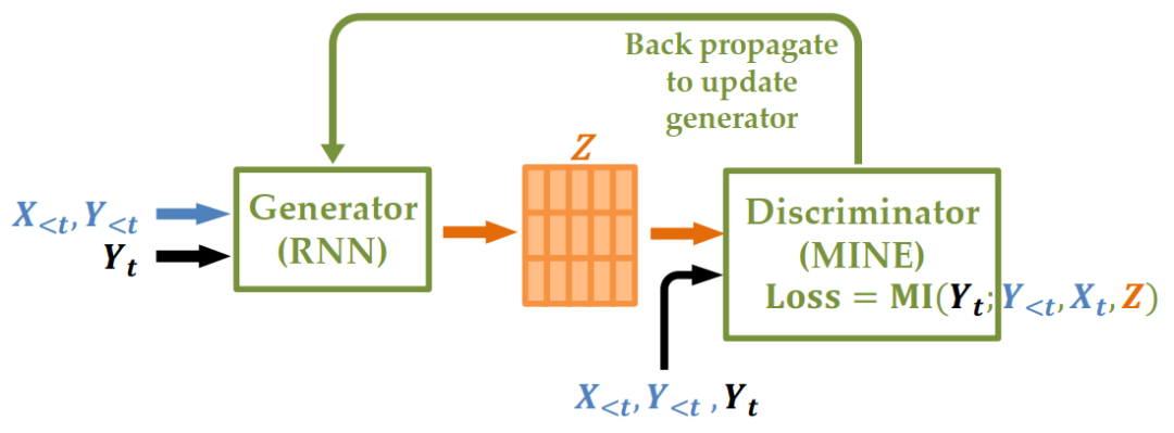 这个结构中的Generator和Critic也可以按需具体的问题而使用不同的神经网络。Generator可以是任何神经网络,比如CNN,RNN,LSTM等;而Critic也可以是任何能估算互信息的神经网络,比如MINE [5] 和SMILE。在这篇文章里,我们主要考虑的是从Y<t和 X<t的时序信息学习到 Zt 的表征,所以Generator使用了RNN,Critic使用了MINE。
