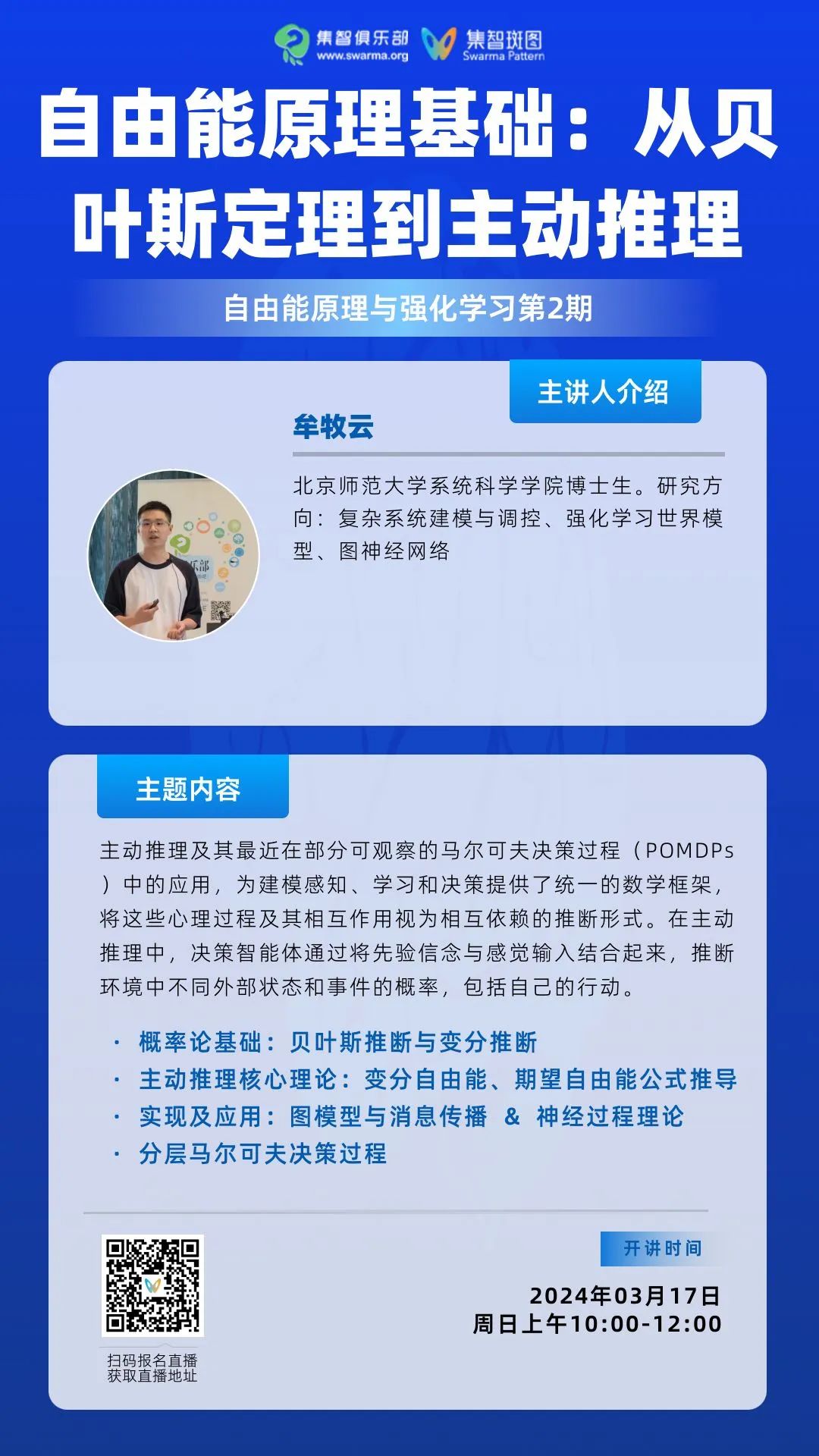 集智俱乐部联合北京师范大学系统科学学院博士生牟牧云,南京航空航天大学副教授何真,以及骥智智能科技算法工程师、公众号 CreateAMind 主编张德祥,共同发起「自由能原理与强化学习读书会」,希望探讨自由能原理、强化学习世界模型,以及脑与意识问题中的预测加工理论等前沿交叉问题,探索这些不同领域背后蕴含的感知和行动的统一原理。读书会从3月10日开始,每周日上午10:00-12:00,持续时间预计8-10周。欢迎感兴趣的朋友报名参与!