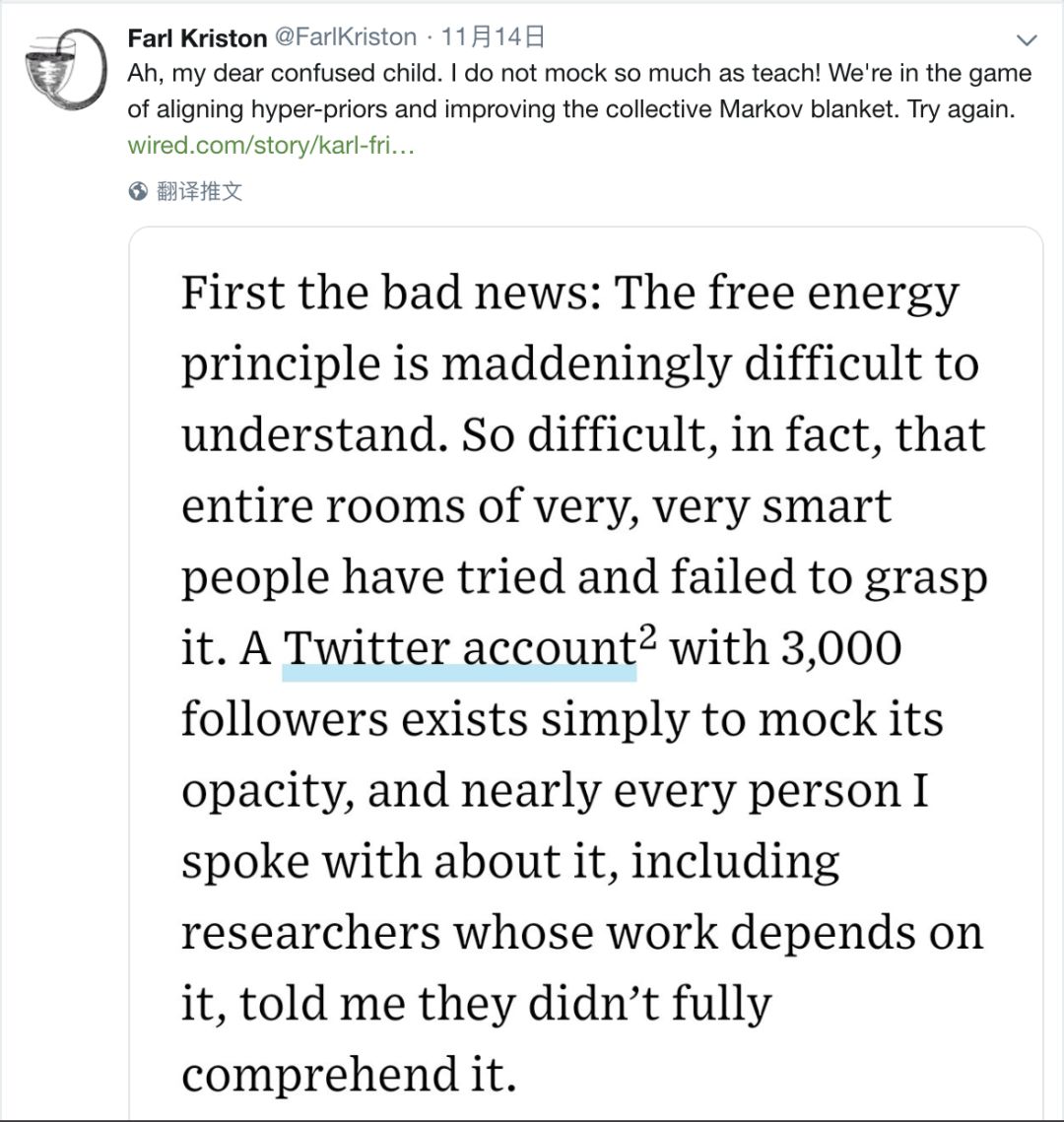 *注:该Twitter账号为“@FarlKriston”。其推文如下:“生命就是任意(遍历性的)随机动态系统所具有必然的与意外的属性,并且这个动态系统存在一条‘马尔科夫毯’。你可少不了这条毯子!”