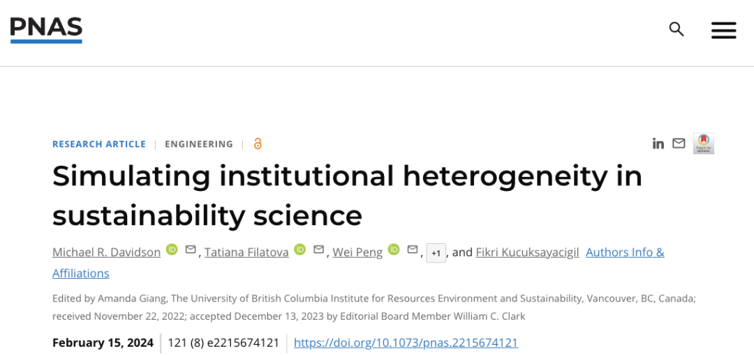 论文题目:Simulating institutional heterogeneity in sustainability science 论文期刊:PNAS 论文链接:https://www.pnas.org/doi/10.1073/pnas.2215674121