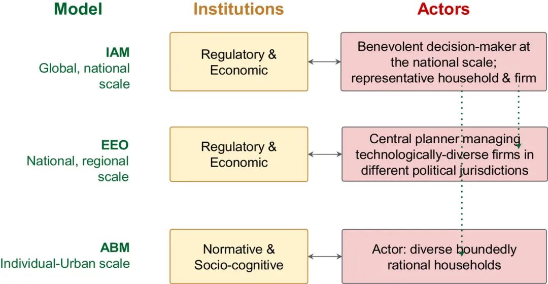 图1 研究中三个模型的对比。代表不同类型和粒度的参与者、机构以及参与者与机构之间的互动