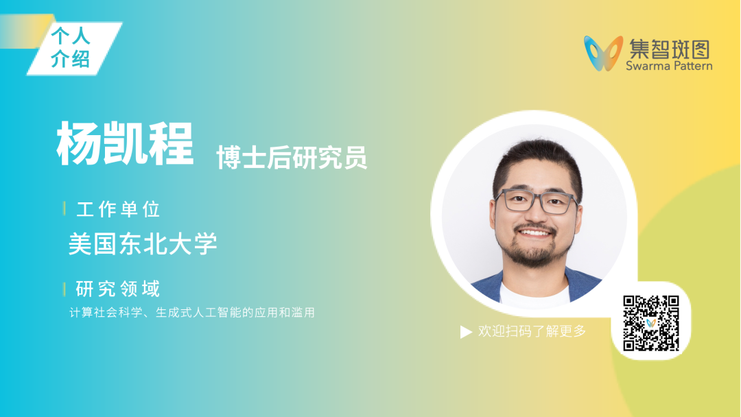 杨凯程,美国东北大学博士后研究员,研究领域为计算社会科学,致力于解决社交媒体上的机器人和虚假信息传播问题,以及研究生成式人工智能在这些领域中的滥用和应用。研究成果曾被包括 CNN,BBC,The New York Times 在内的众多知名媒体报道。