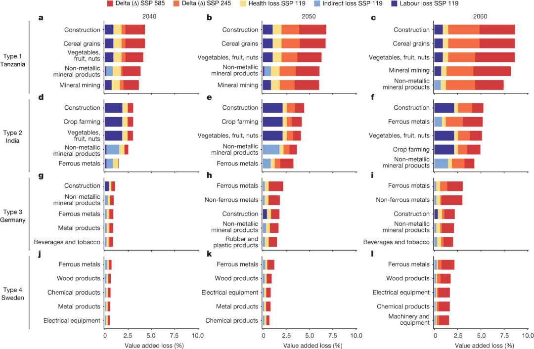 图1 坦桑尼亚、印度、德国、瑞典这4个代表性国家遭受热相关损失最严重的5个工业部门。
