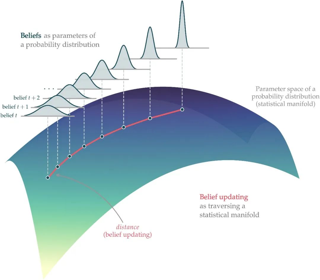 信念更新可以表示为抽象空间中的运动,其中每个点对应一个概率分布。|图源:论文