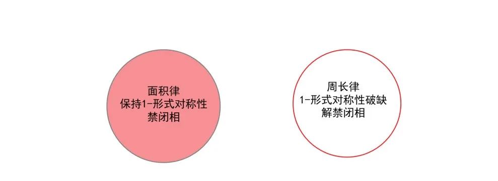 对于只有规范场(胶子),没有物质场(夸克)的杨—米尔斯场论,其中蕴含着离散的1-形式对称性,我们也可以讨论其中胶子的禁闭行为。上面提到的面积律(1)对应于1-形式对称性未发生自发对称破缺的情况,即禁闭状态;而周长律(2)则表明1-形式对称性发生了自发对称破缺,即解禁闭状态。