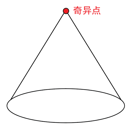 (2) 几何空间包含一个奇异点,即呈现下图的锥形结构。超对称共形场论中的物理自由度就隐藏在这个奇异点当中。