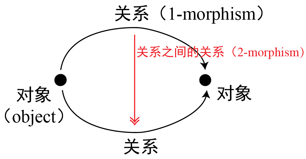范畴是集合论的推广与集大成,同时也是数学的一个重要前沿领域。一个一阶范畴包含了一些对象(object)和对象之间的关系(被称为“态射”,1-morphism)。进一步,我们可以定义二阶范畴(2-category),其中包含关系之间的关系(2-morphism),三阶范畴包含关系的关系的关系(3-morphism),以此类推,甚至到无穷范畴。