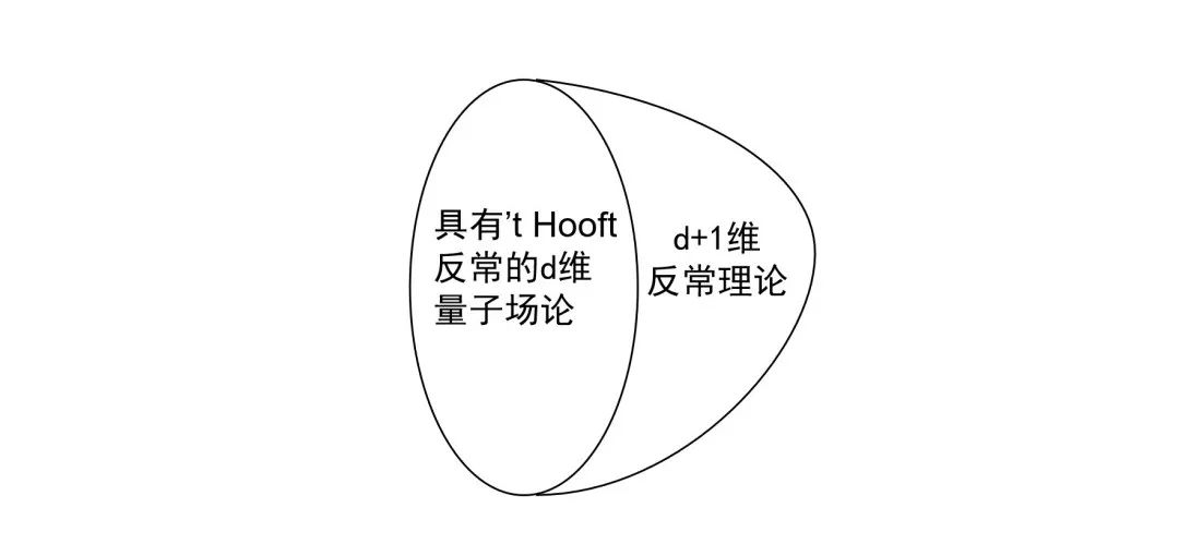 在有’t Hooft反常的情况下,我们通常可以引入一个高一维时空中的“反常理论”(anomaly theory),与原来的物理体系相耦合。换句话说,原来d维的物理体系可以被认为存在于某个(d+1)维带边流形的边界上。反常理论是一个拓扑量子场论,其规范变换正好与d维物理理论中的’t Hooft反常相抵消,这样组合之后的大体系就没有反常,见下图。
