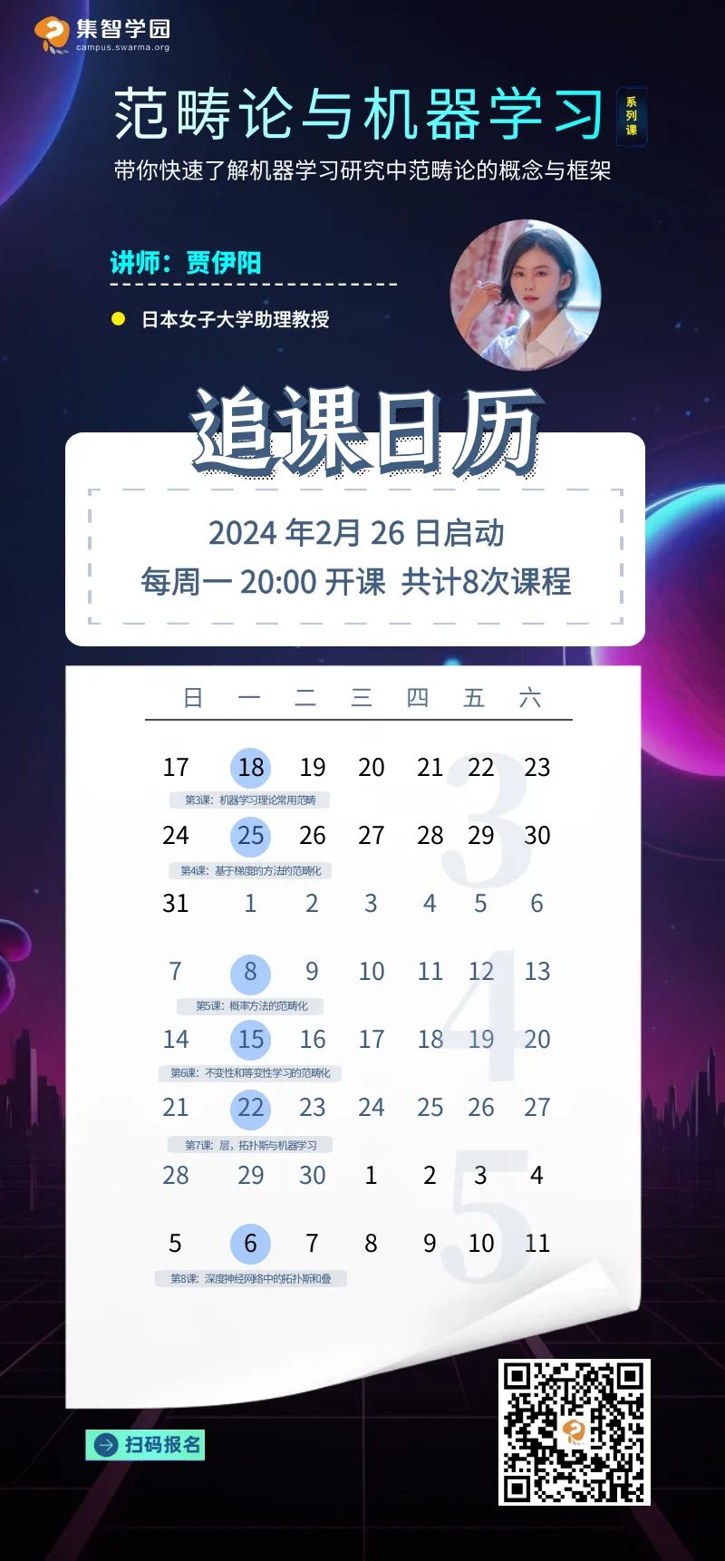 为了帮助大家对范畴论与机器学习这一交叉领域有深入的了解,理解机器学习方法背后的范畴意义,集智学园联合日本成蹊大学助理教授贾伊阳,推出了「范畴论与机器学习」系列课程,旨在面向机器学习领域并且希望深入到理论思想层面、身在数学领域想要利用人工智能解决问题的、以及希望了解一些范畴论应用前景(例如和人工智能、量子计算融合的可能)的研究者,科普机器学习前沿领域论文中出现的范畴论知识。