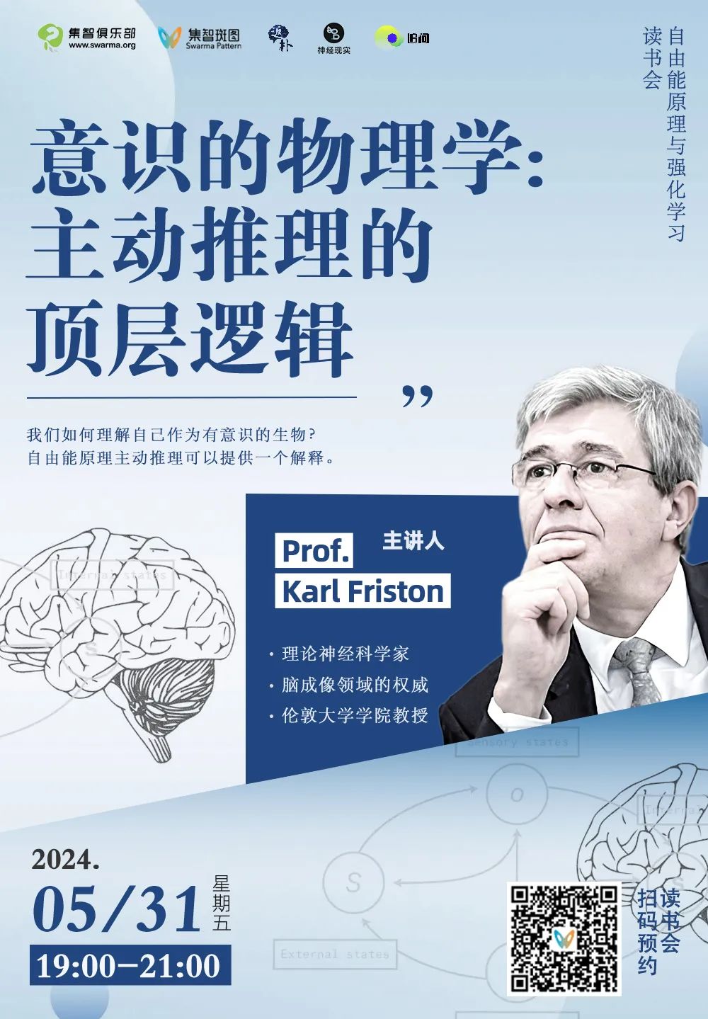 Karl Friston 教授受邀于今晚(5月31日)在集智俱乐部「自由能原理与强化学习」读书会做自由能原理的主题分享,从物理和神经生物学两条道路走向主动推理框架,并有来自复杂科学、物理、神经科学等不同领域的多位学者参与讨论。集智俱乐部将从18:00开始直播读书会发起人、北京师范大学系统科学学院博士生牟牧云的科普分享。欢迎大家参与讨论,也欢迎希望深入探索自由能原理的朋友加入读书会社群,和我们一起开启自由能之旅!