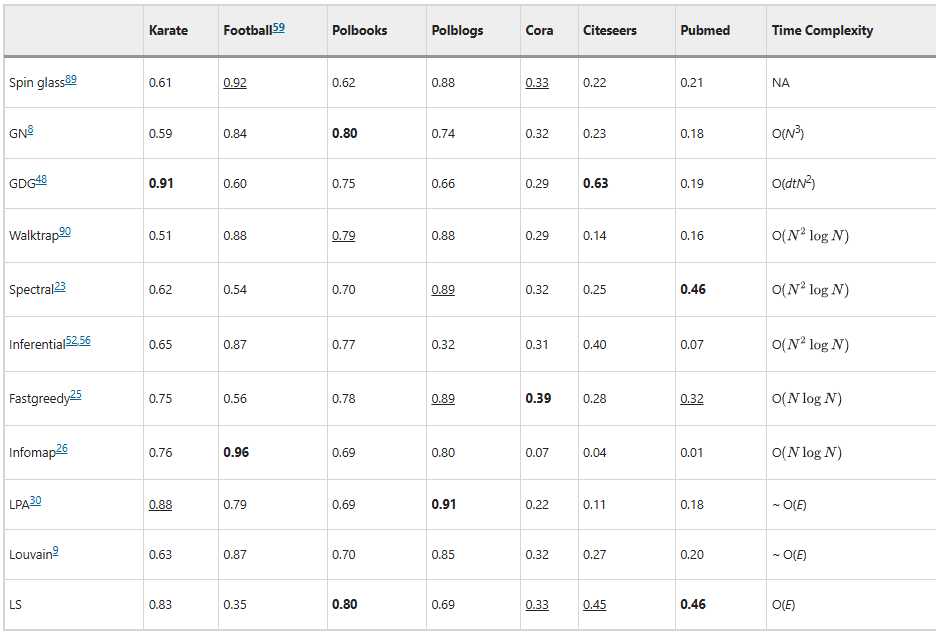 在网络中进行社团检测是一项困难的计算任务。因为网络内的社团数量通常是未知的,并且社团的规模和密度通常不相等,早期学者通常在计算出节点间的某种距离矩阵之后,应用经典的层次聚类算法或其他向量数据聚类的方法,但这种方式对于如何定义节点间的距离非常敏感,而且聚类结构往往也不尽如人意。之后网络科学家们从拓扑结构出发,提出了多类社团检测方法,如最小切割法、Girvan-Newman算法、模块度最大化方法(如Louvain算法)、谱分析算法、基于动力学的算法(如LPA、Infomap、CFinder)等等。