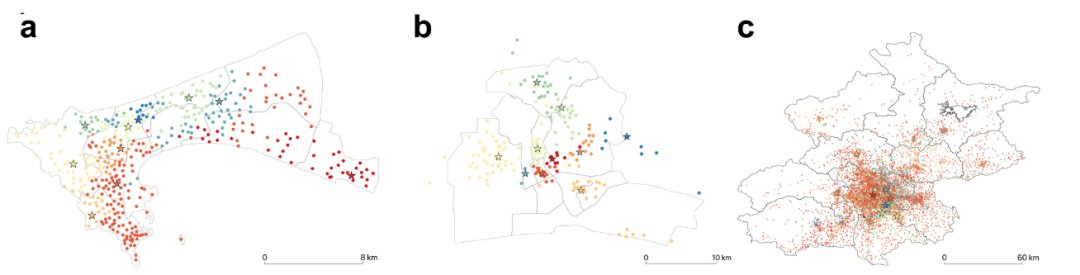 文章通过分析达喀尔(Dakar,塞内加尔共和国)、阿比让(Abidjan,科特迪瓦共和国)和北京三个城市的手机信令数据,使用LS算法识别城市中的社团结构,发现对于较小的城市达喀尔和阿比让,发生紧密交互的社团中的节点在空间上更加互相邻近,而在较大的城市,如北京,社团中的节点在空间上更加混合、在空间中的分布也更加不邻近。
