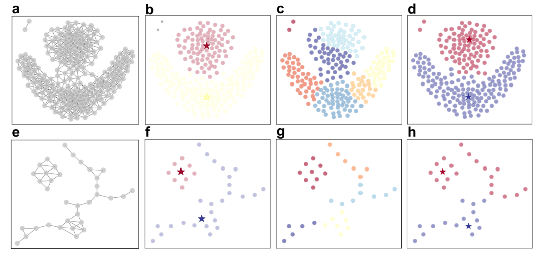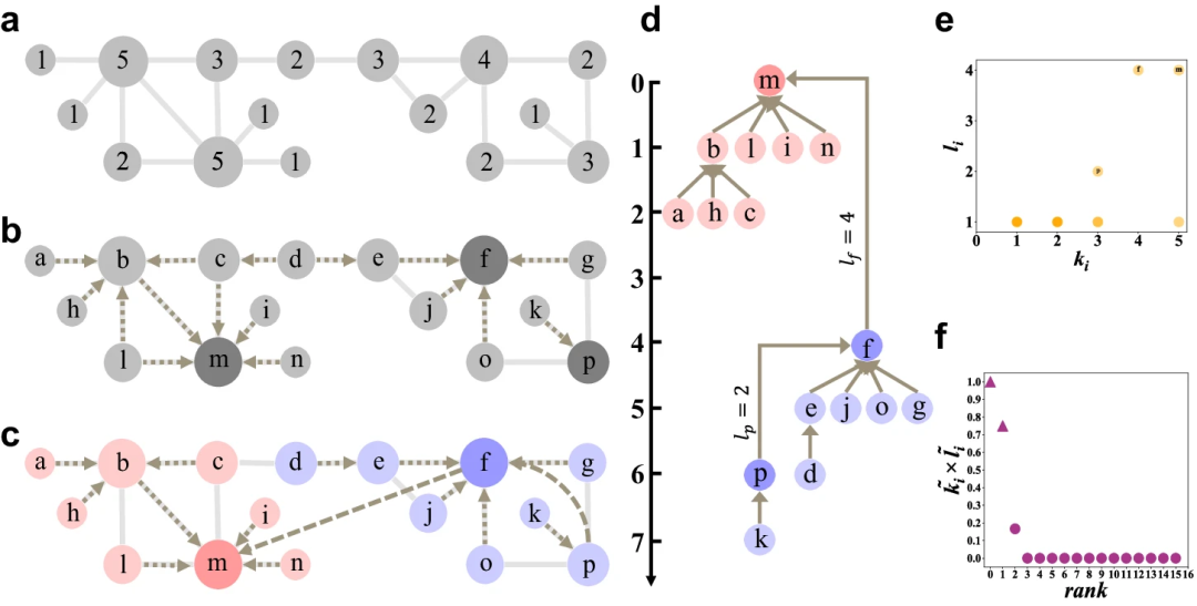 根据节点的度和它们到最近局域领导者的距离,可以确定社团中心为图1e中右上角的节点;另外可以二者的乘积来更定量化地确定哪些节点是社团中心(图1d)。一旦社团中心确定,即可将社团标签沿之前构建的DAG中有向边的反方向传播给相应节点,完成社团划分。