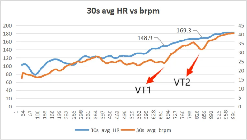 在运动强度区间的边界(即相变点)会产生临界现象。随着运动强度(心率)的增加会出现两个呼吸代偿点(第一通气阈值 VT1 和第二通气阈值 VT2):当运动强度达到 VT1 时,运动能源底物开始由脂肪供能转变为糖原供能;VT2 的运动强度又被称为临界功率/速度(Critical Power/Speed),运动强度低于 VT2 时运动是可长时间维持的稳态,运动强度高于 VT2 时运动很快会达到力竭。