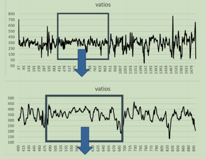 阈值强度运动中的自相似性和分形特征:自行车运动员功率输出在”阈值功率“上下波动。我们可以在功率曲线中看到分形结构,475~685秒的功率曲线和400~895秒的功率曲线是自相似的。